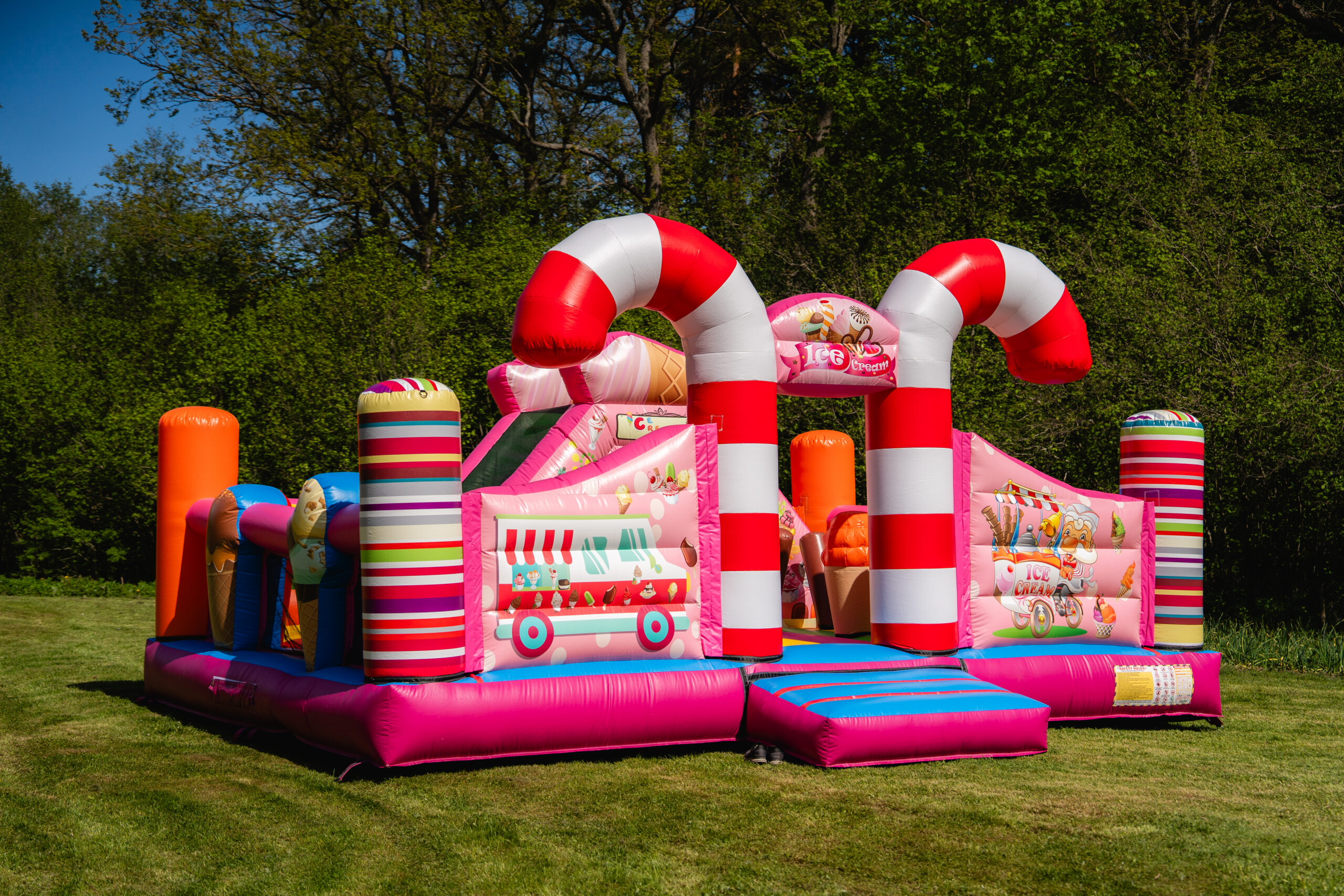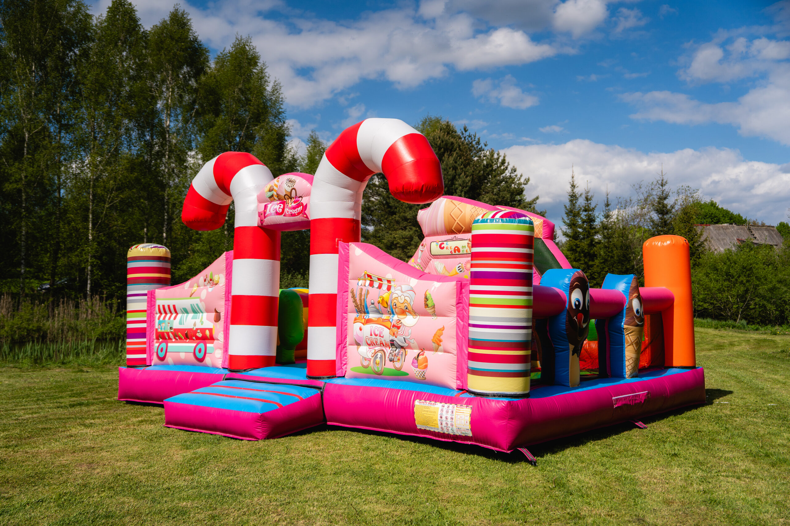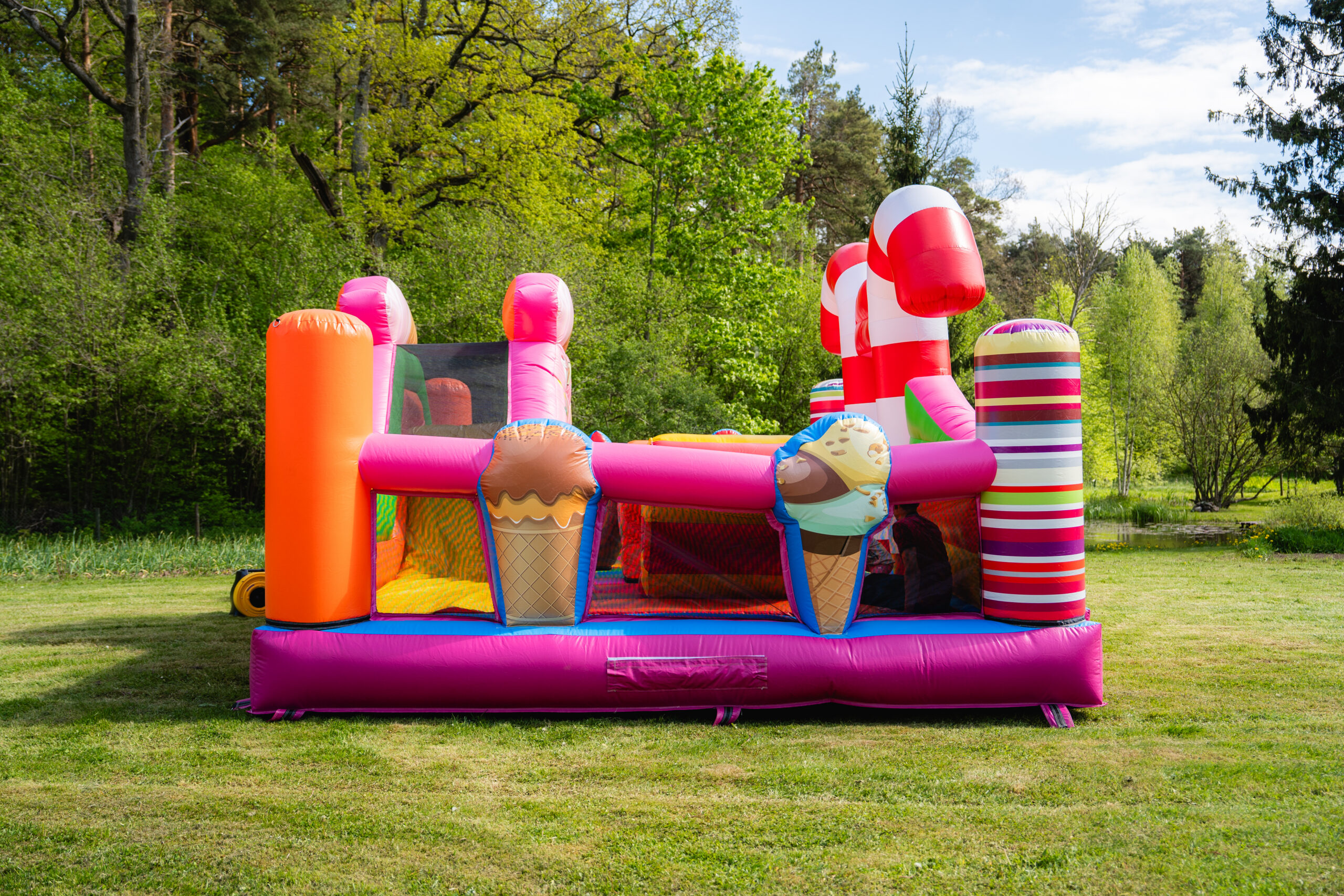 zklaude saldumu pasaulē. Bērnus izklaidēs košās konfektes un smaidīgie saldējumi. Jautrību uz šķēršļiem papildina jautrais 3m nobrauciens pa konfekšu pasaules kalniņu. Kopējais atrakcijas garums 6.7m, augstums 3.4m un platums 5.6m.