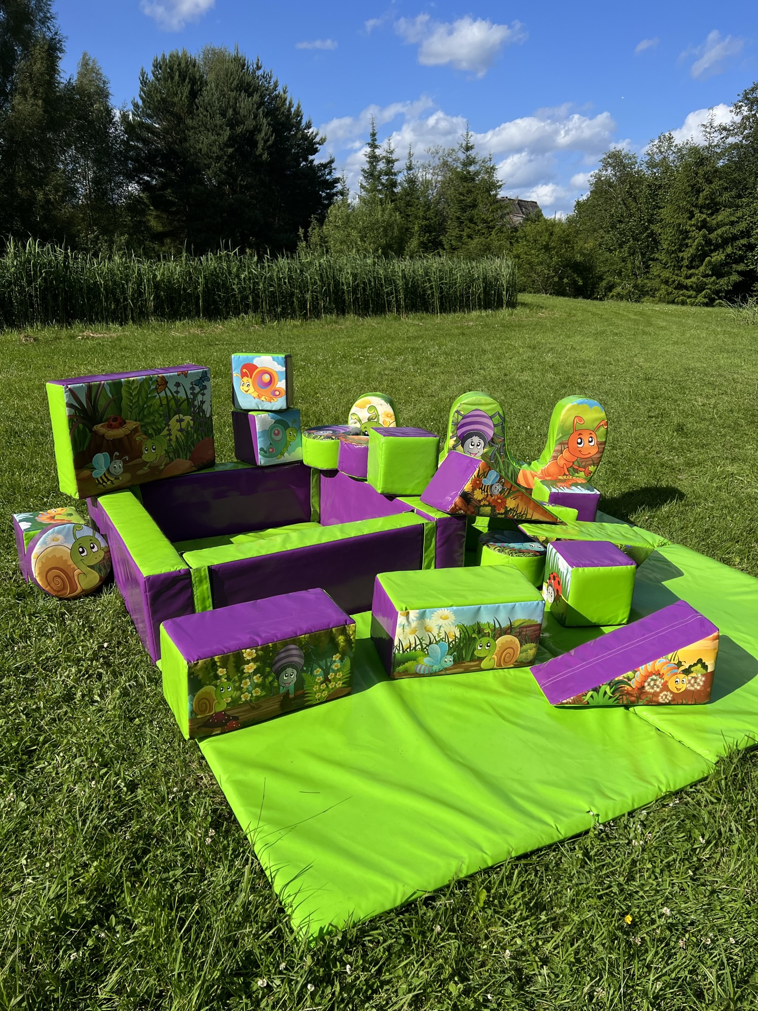 18 mīkstas figūriñas princešu tematikā ar princešu printiem. Dominē rozā krāsa. Otrs komplekts ar kukainīšu tematiku. Dominē załā krāsa. Bumbu baseinam līdzi nāk krāsainas bumbiñas ar kurām tiek piepildīts mīkstais baseins. Baseina izmērs 1mx1m.
